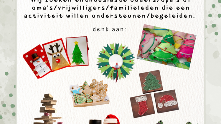 Wij zoeken enthousiaste ouders/opa’s of oma’s/vrijwilligers/familieleden die een activiteit willen ondersteunen/begeleiden tijdens onze middag Stralen in de sfeer van kerst. Zie flyer voor meer informatie. Meld je nu aan via de mail of via deze activiteit.
